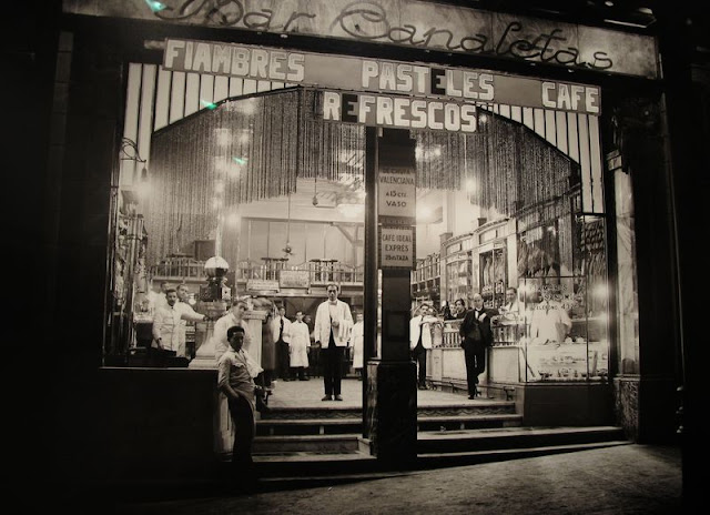 Bien es cierto que suelo quedar más larga que corta, pero en esta ocasión me quedo, como les digo, corta. Cortísima (*). Por ejemplo, la fotografía del Bar Canaletas, me rescató del olvido este bar del que quedan trazas en mi memoria sea porque el letrero, la disposición de la entrada o ambas cosas persistían en el bar que yo pude ver alguna vez en mi niñez. Ahora si no recuerdo mal hay como una especie de recreación con toques de charcutería y es uno de esos sitios que tenemos ahora en las Ramblas que están llenos de turistas. Me parece una imagen tan emocionante, tan sugerente y tan viva, como si por alguna cosa de los neutrinos o vayan ustedes a saber qué, hubiera podido hacer servidora un viaje en el tiempo y hasta verme capaz de salvar esos peldaños y traspasar ese umbral y ver esos camareros tan serviciales y en su papel.